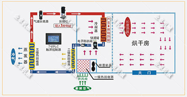 菊花烘干房是利用逆卡諾原理,制冷劑(大部分為混合制冷劑)被壓縮機壓縮,變成高溫高壓的氣體,通過管路(銅管)進入換熱器(冷凝器)中,然后再通過風機,將換熱器(冷凝器)產(chǎn)生的熱量送至烘干房內(nèi)對菊花等物料進行加熱、烘干,從而使菊花得到干燥,濕氣由排濕口排出,