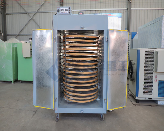 花椒烘干箱是將放好花椒的托盤放在箱內的格子型架子上,啟動后可自動旋轉烘干,保證每個托盤的花椒都能充分干燥。中間無需翻動。