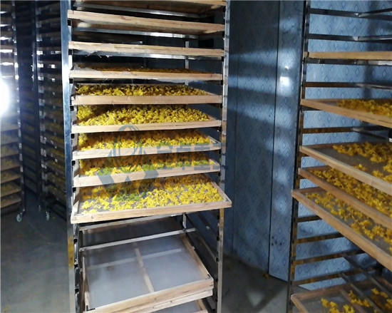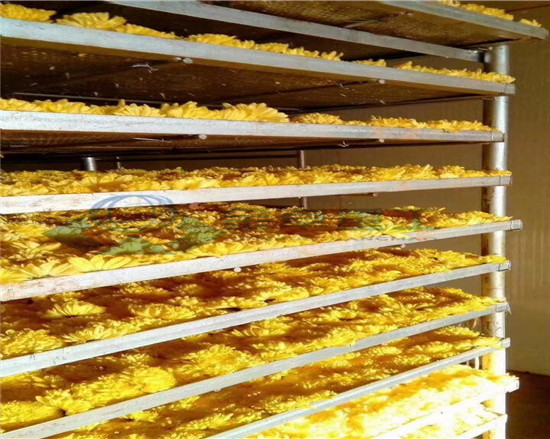 一階段:菊花剛放進去烘干房內,需要一個緩慢升溫的過程,溫度保持在50度以下,時間月20小時,自動排濕就好。