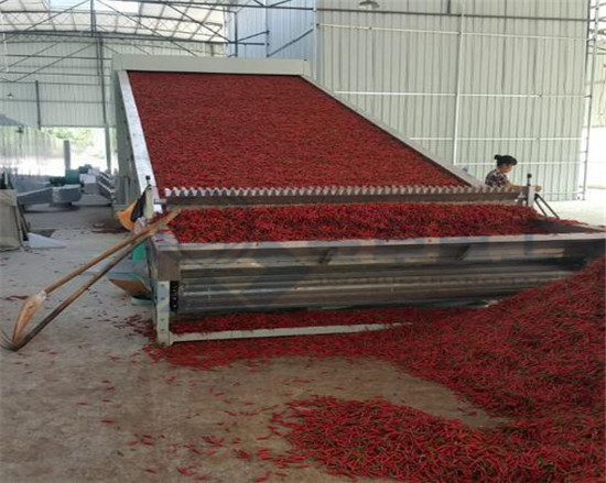 稍大型的是辣椒網帶式烘干機,它采用的是傳動烘干,由傳動裝置拖動在干燥機內往返移動,熱風在物料間穿流而過,水蒸氣從排濕孔中排出,從而達到干燥的目的,箱體長度由標準段組合而成,為了節約場地,可將烘干機制成多層式,常見的有二室三層、二室五層、長度6-40m,有效寬度0.6-3.0m。因此也被用戶形象的稱之為隧道式烘干機,一條產量5噸以上的辣椒烘干機生產線,只需兩人就可以完成,有效節約了人力投資。